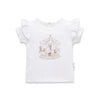 Bring a touch of nostalgic charm to your little one’s wardrobe with this sweet carousel pony tee. Set against a fresh white base, the central print showcases beautifully illustrated ponies riding a classic merry-go-round, brought to life in a soft palette pastels and creamy neutrals. Designed for both comfort and style, it features fluttery frill sleeves and a gently curved neckline, making it perfect for pairing with our denim shorts or layered under our overalls for a complete outfit.