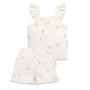 Crafted from GOTS certified organic cotton for exceptional comfort and sustainability. The sleeveless top features an all-over playful print, complete with delicate ruffled shoulder straps and a sweet pink bow. Paired with coordinating shorts, finished with a ruffled hem and an elasticated waistband for ease of wear, the set is accented with a matching bow detail. A delightfully cute staple this season.