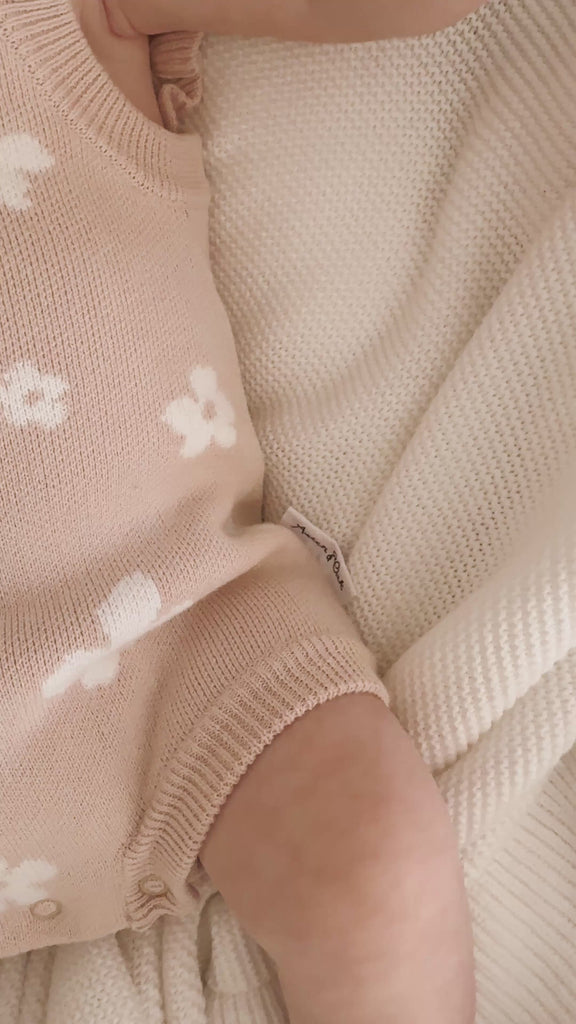 Lovingly crafted from natural cotton knit, in a delicate pale pink, our Flower Knit Romper is an effortlessly elegant piece for the season. A gorgeous gift or treasured keepsake our knit romper features a beautiful floral jacquard pattern and soft ruffle detailing at the shoulders—perfect for the special family photo or occasion.